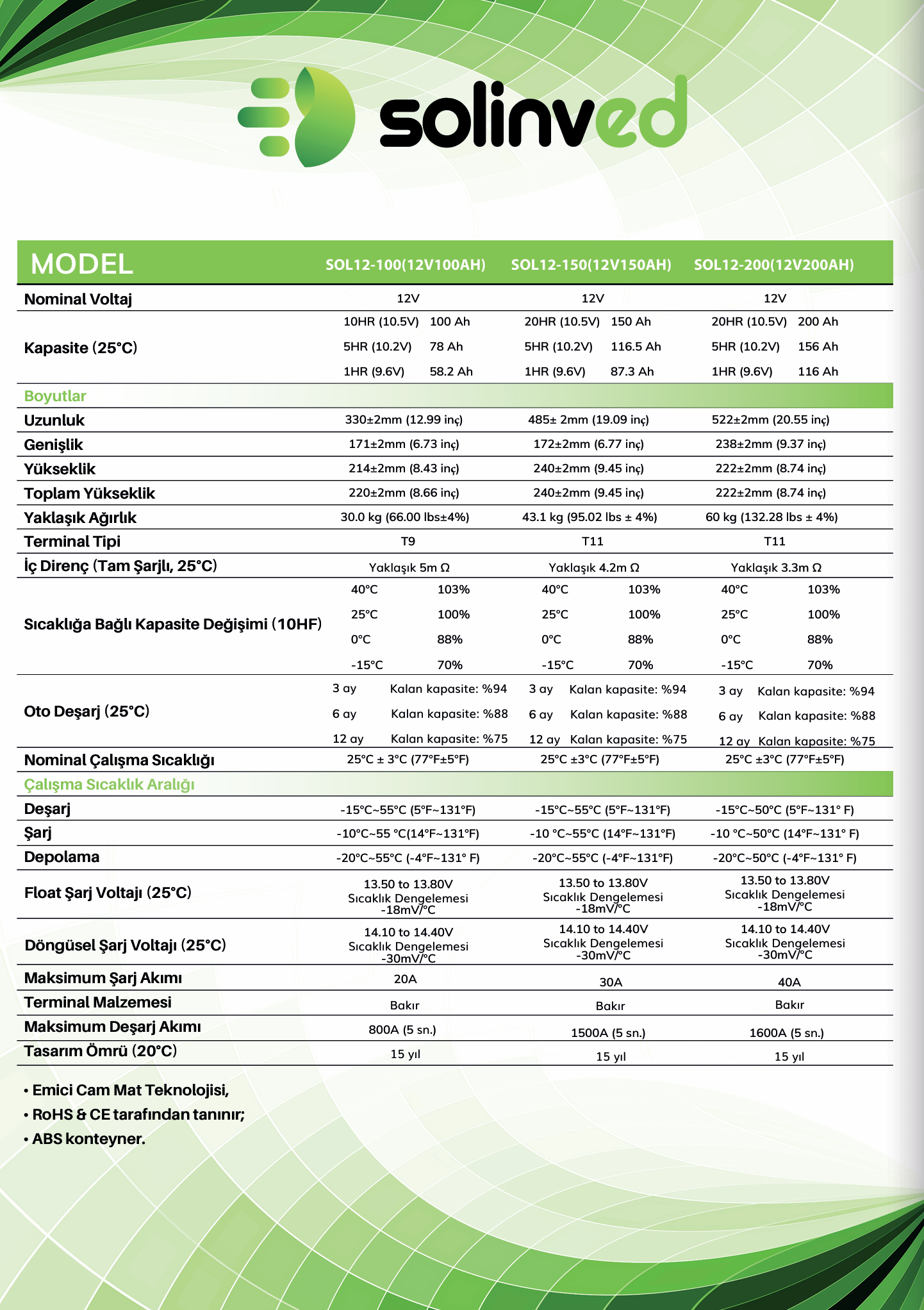 - Yüksek Verimlilik: Güneş enerjisi sistemleriyle uyumlu olan bu akü, güneş panellerinden gelen enerji ile hızlıca şarj olur ve daha verimli enerji kullanımına olanak tanır.