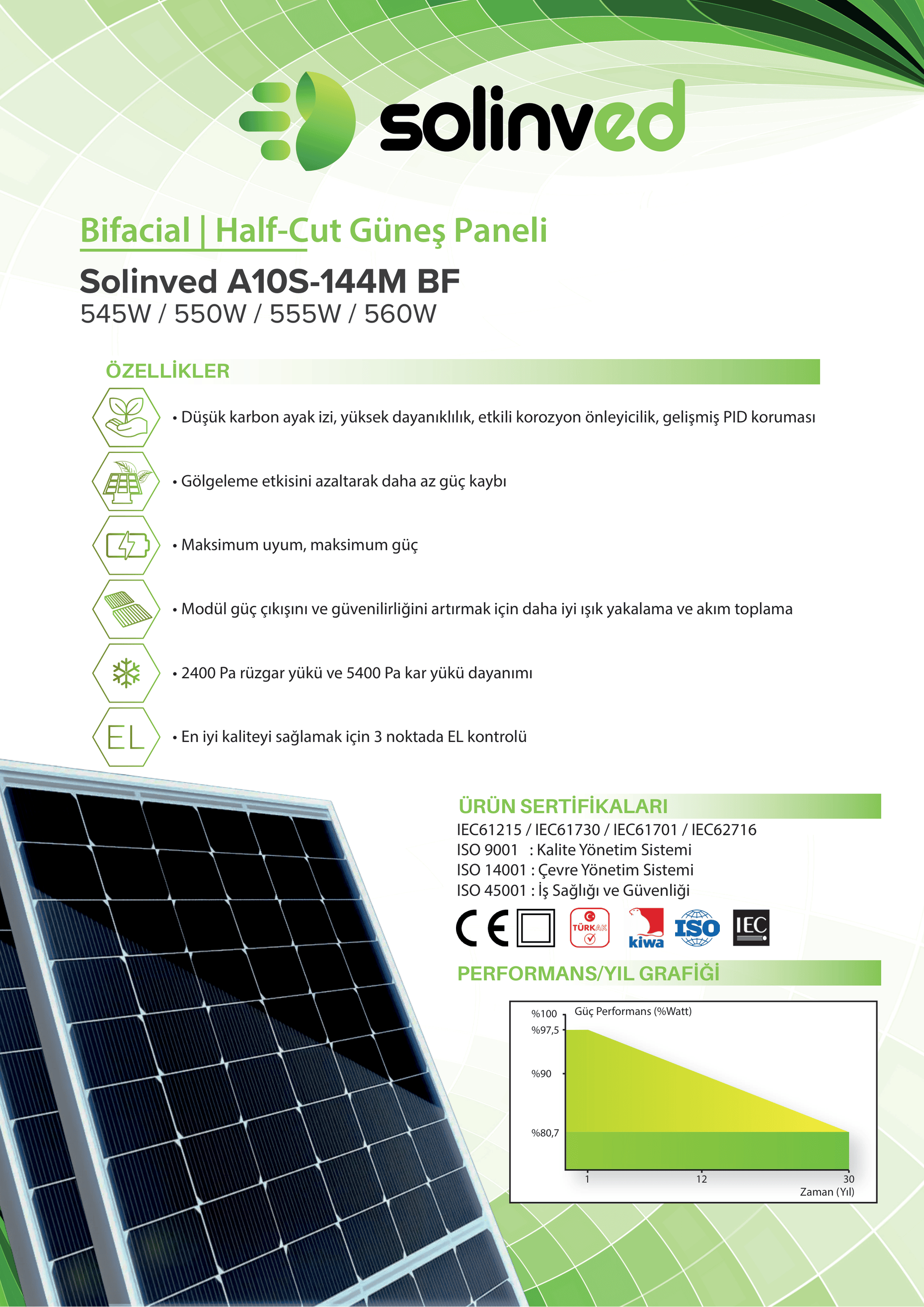 - Performans Garantisi: 25 yıl (ilk yıl %98.0, 25. yıl %84.8 güç çıkışı)